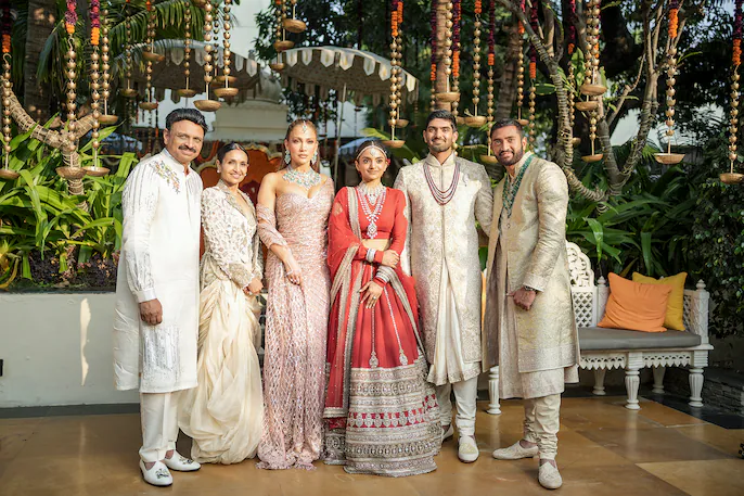 لوپز تنها به اجرای شبانه بسنده نکرد و در یکی از آیینهای سنتی صبحگاهی نیز با پوشیدن ساری صورتیرنگ و جواهرات الماسنشان ظاهر شد. او حتی از اکسسوریهای سنتی هندی مانند مانگتیکا استفاده کرد که تحسین کاربران را برانگیخت. تصویری از او در کنار راما راجو مانتنا، پدر عروس و چهره شناختهشده صنعت داروسازی آمریکا، بهسرعت در فضای مجازی دستبهدست شد.