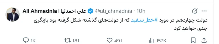 علی احمدنیا (رئیس اطلاعرسانی دولت): اعلام کرد دولت چهاردهم بازنگری جدی درباره «خط سفید» خواهد داشت.
