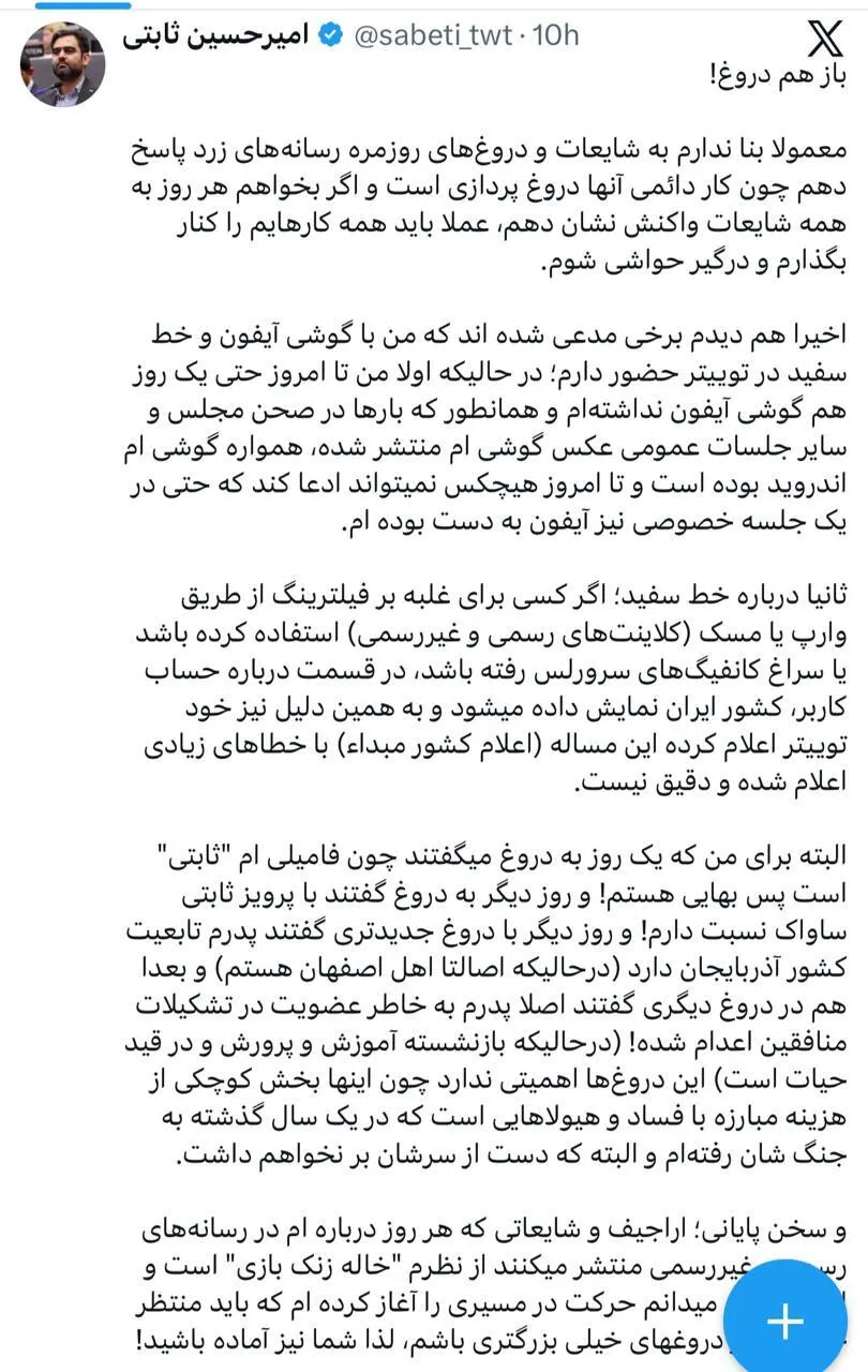 پس از موج افشاگریهای موقعیت جغرافیایی کاربران ایکس و مطرح شدن ادعاهایی درباره استفاده برخی چهرهها از «سیمکارت سفید» و آیفون، امیرحسین ثابتی نماینده مجلس در توییتی مفصل این موضوع را «دروغ» خواند.
