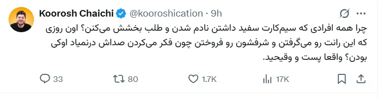 «چرا همه کسانی که سیمکارت سفید داشتند حالا نادم و طلب بخشش شدهاند؟ روزی که این رانت را میگرفتند و شرفشان را میفروختند چون فکر میکردند کسی نمیفهمد، مشکلی نداشتند. واقعاً چقدر پست و وقیحید.»